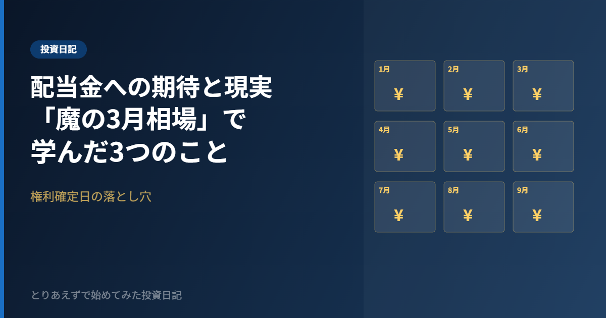 「配当金はもらえるが、株価下落(権利落ち)とセット」「魔の3月相場は本当に荒れやすい」「NISA口座を使った非課税の恩恵は大きい」——これらの体験知識は、次の権利確定日に向けてより賢く立ち回るための財産になりました。